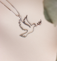 A graceful silver necklace featuring a beautifully sculpted dove carrying an olive branch—symbolizing peace, hope, and harmony. This meaningful piece adds a serene elegance to everyday wear.